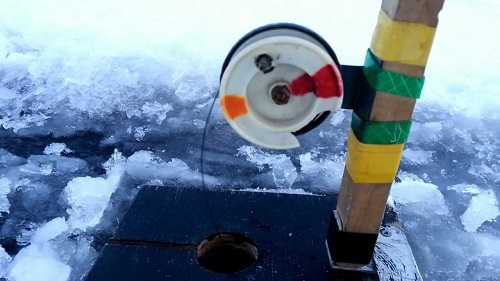 А саму катушку необходимо устанавливать так, чтобы она была приподнята надо льдом приблизительно на десять (или чуть больше) сантиметров.