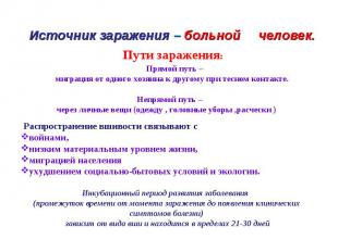 Считается, что вшивость, или педикулез сопутствует местам, которые являются очагами природных катаклизмов и кризисных ситуаций в обществе. Вшивость – показатель низкой санитарной культуры, результат пренебрежения элементарными гигиеническими правилами (регулярным мытьем тела и головы, сменой белья, уходом за волосами). Но всё же, несмотря на это, ни один образованный, воспитанный и чистоплотный человек не может быть застрахован от заражения этими паразитами. Вши чрезвычайно плодовиты. Заболевание педикулезом происходит от зараженного вшами человека. Вши мигрируют от одного хозяина к другому при тесном контакте, через личные вещи (одежду, головные уборы, расчески и даже мягкие игрушки). Наиболее активно они мигрируют, когда у человека повышается температура тела вследствие заболевания, физической нагрузки, перегрева в жаркую погоду. Вши плохо переносят высокую температуру. Вследствие этого они перемещаются к кончикам волос и, легко отцепляясь от них, в ряде случаев находят нового хозяина.