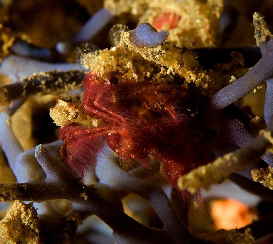 Это существо больше похоже на клок рыжих волос, но на самом деле - это краб с красноватой шерстью. Волоски используются для сбора планктона - основного источника пищи. Когда крабы теряют волоски (такое происходит с возрастом), на клешнях остаются фолликулы, помогающие выживать и идеально подходящие для поиска еды.