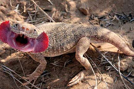 Ее называют жабоголовой агамой. Маленькая ящерица обитает в пустыне и удивляет необычными повадками. Круглоголовки общаются между собой, закручивая и скручивая хвосты, и вибрируют телами, чтобы быстро закопаться в песок. Желающих полакомиться ими, ящерица вынуждает к бегству, демонстрируя причудливые колоритные ротовые складки, которые вы можете увидеть на фото.