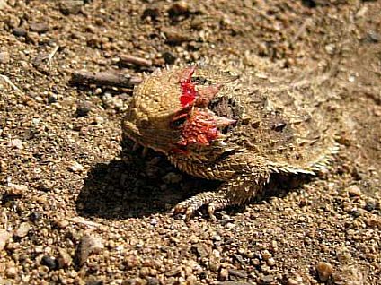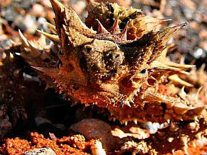 Или "рогатая " ящерица. Свое название получила за округлые формы и жирное тело, покрытое толстым щитом рогов и шипов. Обитающая на песчаных почвах в условиях засухи, ящерица питается исключительно муравьями и может похвастаться одним из самых жутких механизмов защиты от врагов: в минуты опасности она способна до предела повысить кровяное давление в сосудах головы, пока мелкие окологлазные сосуды не лопнут и не выстрелят струйками крови в нападающего.