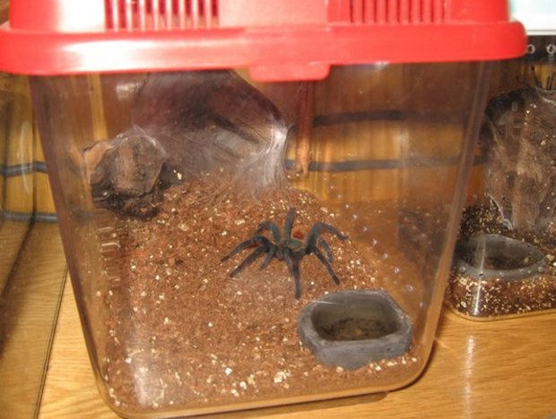 Террариум также не должен быть слишком высоким, чтобы при падении со стенок питомец не повредился. К примеру, для взрослых птицеедов вполне достаточно контейнера таких параметров: 30*30*20 см. Для молоденьких паучков-птицеедов (возраст до нескольких линек) вполне хватит пластикового контейнера размером 10*8*6 см. После 7-10 линек можно прикупить жилище большего размера, исходя из габаритов питомца.