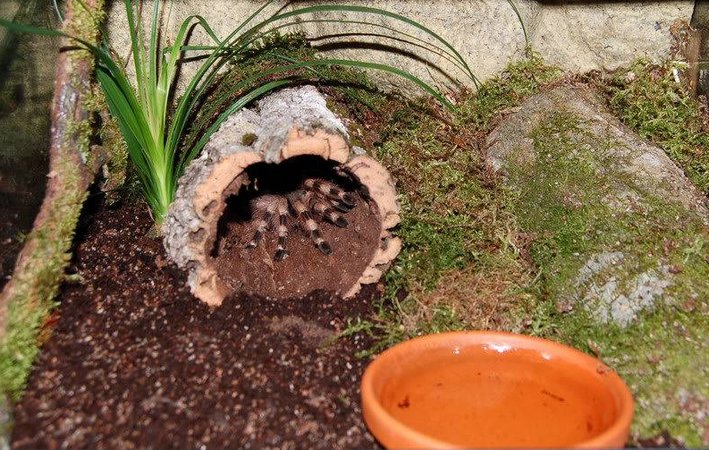 Опрыскивать субстрат из пульверизатора не стоит, вместо этого лучше использовать шприц без иголки или лейку с тонким отверстием. Важно на глаз определить, когда влаги будет достаточно (субстрат должен намокнуть на 2/3). У взрослых особей в контейнере обязательно должна быть поилка, подобрать ее размер стоит таким образом, чтобы питомец не мог в нее поместиться и утопиться. Имейте в виду, что нельзя допускать в террариуме разведения болота. В условиях чрезмерной влажности легко заводятся мошки, плесень и грибок, которые могут погубить членистоногого.