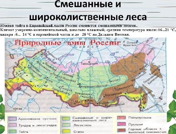 Смешанные и широколиственные леса, располагающиеся между степями и тайгой, занимают примерно 28% от площади всей России.