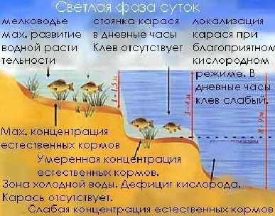При длительной жаре, в особенности при отсутствии дождей и при образовавшейся засухе рыба уходит на дно в самых глубоких местах и впадает в состояние, напоминающее летнюю спячку. Если в это время и вести ловлю карася, то только в глубине водоема и желательно без прикормки, растворение которой отнимет так необходимый рыбе кислород.