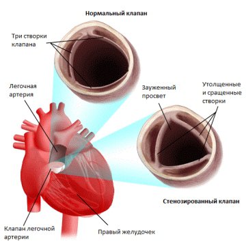 При стенозе клапана легочной артерии наблюдается повышение градиента давления между артерией и правым желудочком более 50 мм рт. ст., проводят хирургическое вмешательство — вальвулопластику.