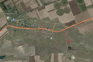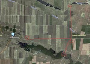 В этот день мной была запланирована поездка на разливы Калауса, для обследования мест ловли и наличие поклевок линя, который в это время должен был активизировать клев. В эту поездку, мной была взята надувная лодка так, как на разливах делать без нее не чего. Выезд из Ипатово состоялся рано утром, с расчетом, чтобы попасть туда на рассвете. Подъехав к Воздвиженскому, я пересек его и, выехав на дорогу в щебеночном исполнении (на карте обозначено цифрой 1), ведущую на Типки, двинулся на разливы.