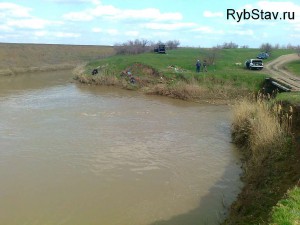 Вот здесь рыба ловилась, рыбаки систематически выдергивали из воды хорошеньких карасей грамм на шестьсот. Снасть была сделана таким образом. Спиннинг с катушкой, на конце лески привязана кормушка, чуть выше два крючка. Сесть было негде, все удачные места были заняты. Рыбаки, забрасывая снасти, путались друг с другом, что создавало неудобства рыбной ловли. Посмотрев как рыбаки выуживают карасей, я поехал дальше. Подъезжая к Дербетовке со стороны Дивного, с левой стороны перед селом находится водоем (на карте обозначено цифрой 6). Проезжая его, я не смог спокойно проехать мимо. На берегу стояло около двух десятков машин. Остановившись возле одного из рыбаков, я стал расспрашивать об улове и наживке применяемой при ловле. Оказалось, что рыбак сидел здесь с утра и поймал ведро карасей, поклевки были уверенные только на красного опарыша, которого и применял рыбак. Соседние рыбаки пользовались навозным червем, но результат был не такой ошеломляющий.