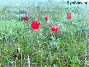 Доехав до места, где дорогу пересекает электрическая линия (на карте обозначено цифрой 2), я повернул вправо к разливам Калауса. Дальше пошла грунтовая дорога. Сразу же после поворота я увидел поляну красных бузлюков, раскинувшуюся на несколько десятков метров. Красные тюльпанчики красовались на поляне.