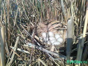 Проплыл около ста метров, я приметил хорошее местечко. Привязал лодку к камышам, прикормил рыбу, и стал ждать. Поклевки не было. Затем я опять проплыл около ста метров, и увидел в камышах чье-то гнездо.