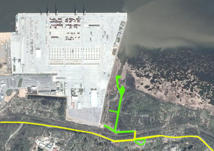 Заезд с приморского шоссе через заправку Шел. Дорога проходит мимо КПП, который давно не действует. На всякий случай есть запасной вариант – грунтовая дорога, идущая из Лисьего Носа вдоль железнодорожного полотна. На сколько я помню по прошлым годам — порт зимой не используется.
