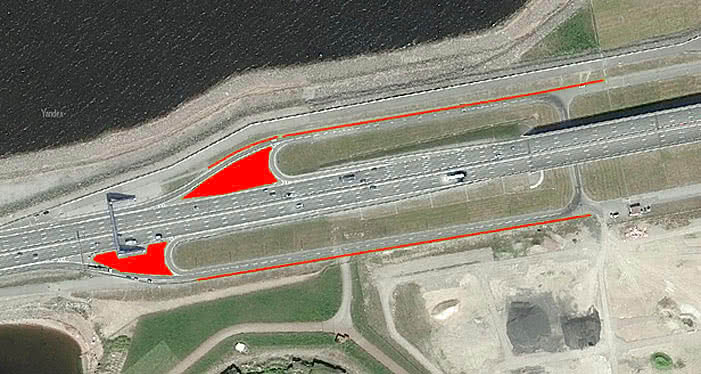 Стоянка у тоннеля – это рыболовная мекка. Машины тут есть всегда. В любое время года, в любую погоду, в любой сезон тут присутствуют рыбаки, ища свое рыбацкое счастье. Стоянка разделяется дорогой на две части. С внешней стороны кольца – это довольно небольшой треугольник с выходом надземного перехода и кусочек обочины.