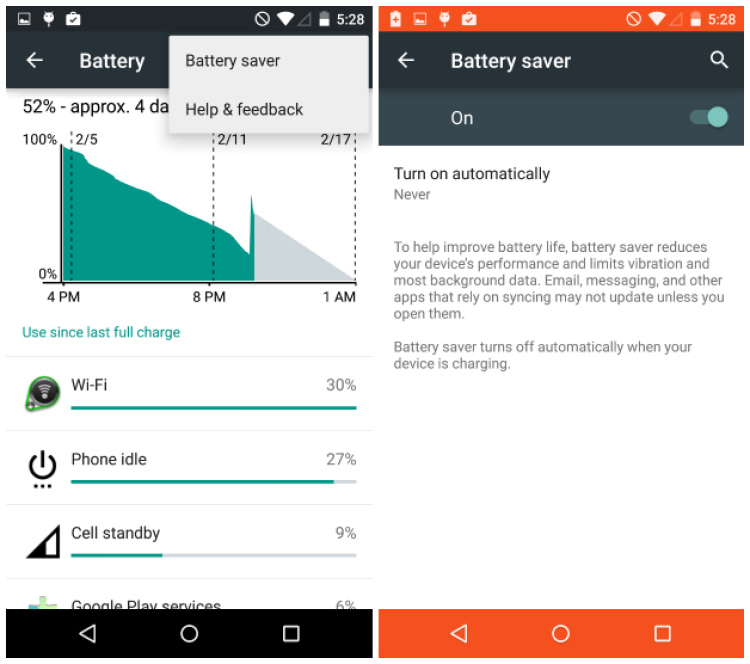 Настройки-> Батарея-> Энергосбережение (поставить галочку)