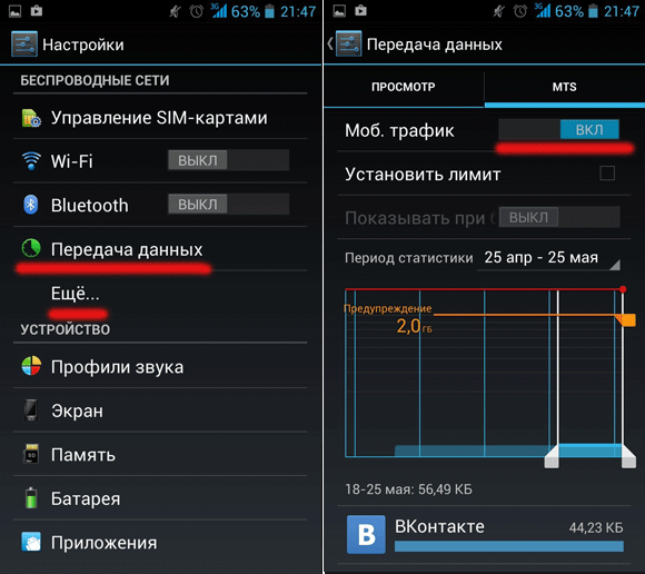 "Настройки-> Ещё-> Мобильная сеть-> Передача данных"