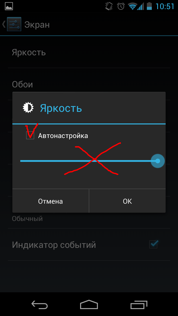 Настройки-> Экран-> Яркость-> вправо (увеличение); влево (уменьшение); АВТО (автоматическая регулировка).