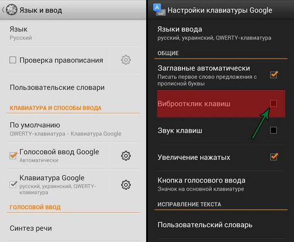 Зайдите в Настройки-> Язык и ввод -> Клавиатура Android или клавиатура Google -> Виброотклик клавиш (снимаем или ставим галочку)