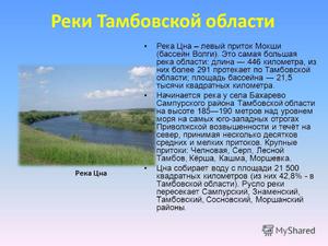 В области существует множество рек, но крупных не очень много. Основная часть водных ресурсов представлена именно в виде небольших рек. В основном реки Тамбовской обл. принадлежат к бассейну Волги, и лишь их небольшое число входит в бассейн Дона.