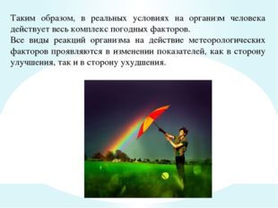 Таким образом, в реальных условиях на организм человека действует весь комплекс погодных факторов. Все виды реакций организма на действие метеорологических факторов проявляются в изменении показателей, как в сторону улучшения, так и в сторону ухудшения.