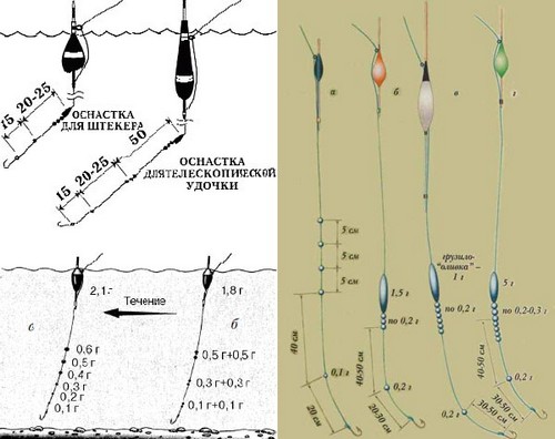 На реках с сильным течением рационален поплавок плоской формы с тонким килем. Огрузка может быть в виде дробинки или скользящего типа. Можно размещать несколько грузиков по длине основной лески. В ночной период лова поплавки выбирают чувствительные, не превышающие по весу пяти грамм. Достаточно будет огрузить его тремя-четырьмя дробинками.