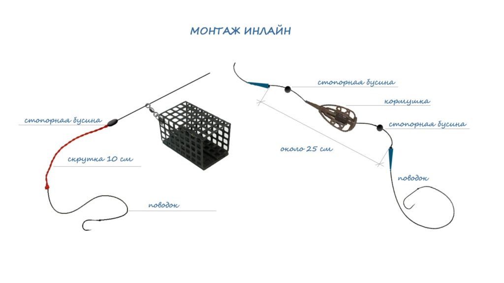 В монтаже ин-лайн, скрутка 10 см, между основной леской и поводком, помогает кормушке не запутываться.