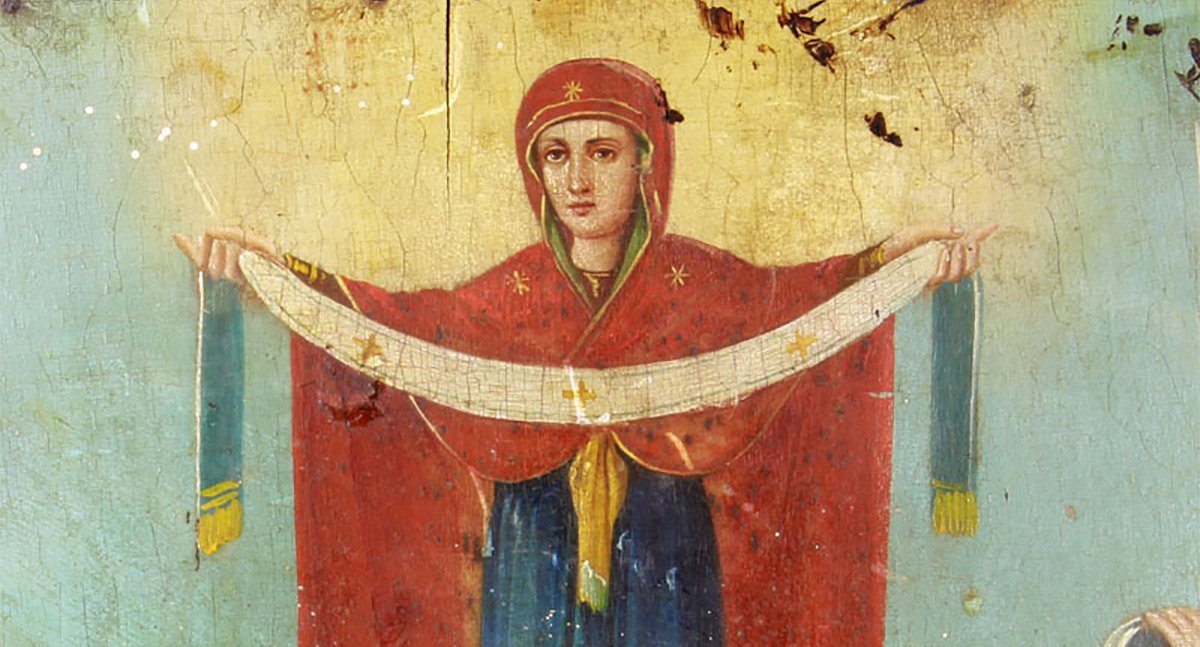 Согласно легенде, когда враги окружили древний византийский город, Дева Мария в окружении ангелов в белоснежных одеждах спустилась с небес. Чтобы защитить невинных людей от нападок иноверцев и от смерти от вражеской руки, Богородица сняла с себя сияющее покрывало и накрыла им всех горожан до единого.