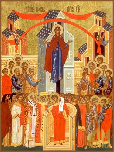 Согласно старинному преданию, более тысячи лет тому назад в Византии в городе Царьград произошло удивительное событие. Враги окружили весь город, и жители, ища спасения, собрались в храме, где хранилось головное покрывало Богородицы. Каждый присутствующий тогда в храме долго молился, призывая Господа и Богородицу уберечь их от вражеского нашествия. И когда наступила глубокая ночь, Богородица спустилась на землю, сняв с головы свое покрывало и покрыв им стоящих в храме людей.