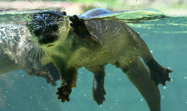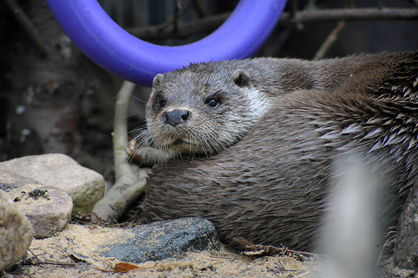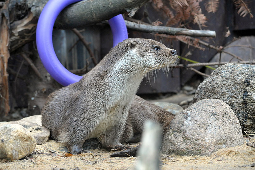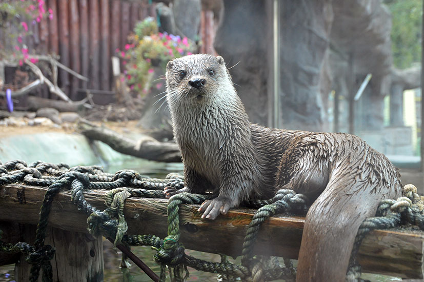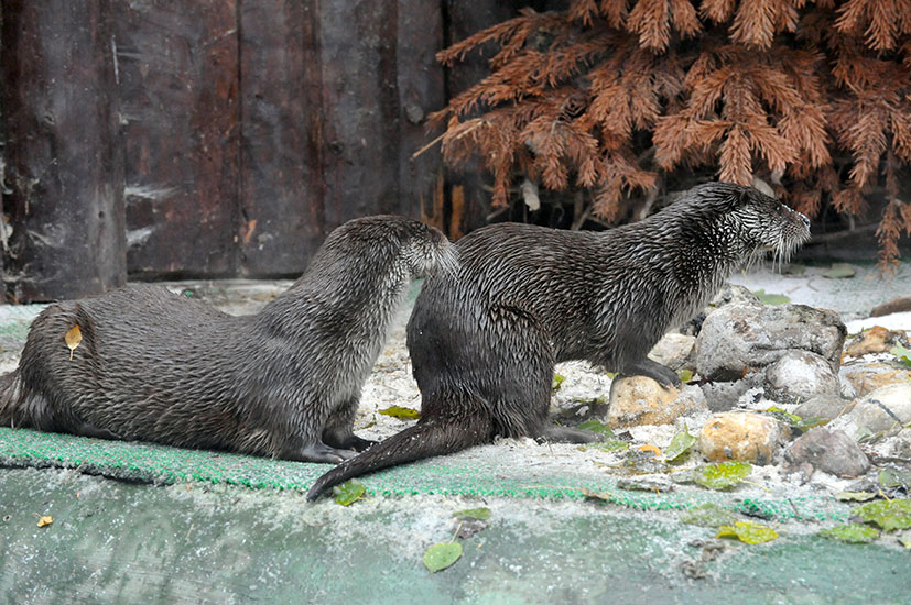 В зоопарке наши выдры живут уже давно, их можно назвать даже старожилами. Животные хоть и очень взрослые (самец Гаврил родился в 2007 году, а самка Льдина в 2005 году), радуются посетителям, как маленькие, и даже устраивают ради них «шоу» - прыгают, стоят столбиками, извиваются в воде вьюнами. Выдры очень любят как пловцы в бассейне «накручивать километраж», плавая на спине от одного края вольера к другому. Вольер у выдр просторный, соединяет в себе три небольших бассейна разной формы и глубины с проточной водой. Есть у зверьков и возможность спрятаться от внимания посетителей, они могут в любой момент скрыться во внутренние убежища через маленькие квадратные отверстия, занавешенные прозрачной резиновой дверцей, и расположенные внизу деревянной стены вольера.