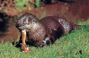 Евразийская выдра речная -мелкий хищник. Самцы достигают длины тела в 90 см и веса в 10 кг, самки - значительно меньше (55 см и 6 кг). Основной их корм - небольшая рыба, но не брезгуют эти охотники яйцами и птенцами речных птиц, лягушками, ручейниками, Участок обитания одной особи довольно небольшой - 250 м прибрежной полосы, которую она метит экскрементами. Но соседи-выдры живут мирно, и в голодное время сходятся в места, где есть корм. Зверек роет одну постоянную нору, вход в которую открывается под водой. Само же логово - сухое, теплое, выстланное мхом, травой и листьями. Зимой животные держатся поблизости полыньи или промоин.