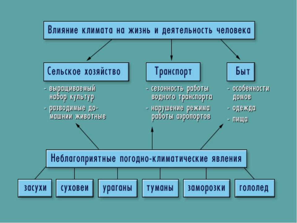 Как фактор природной среды климат влияет на географическое распределение растительности, почв и водных ресурсов и, следовательно, на землепользование и экономику. Различное влияние климата на жизнь, самочувствие, привычки и работу человека хорошо известны. Суровый и холодный климат оказывает неблагоприятное влияние на человека. Наука, которая изучает воздействие климата на здоровье человека, называется климатологией. Климат может влиять на человека прямо и косвенно. Причем основные действия на организм оказывают внезапные, резкие изменения климатических условий.