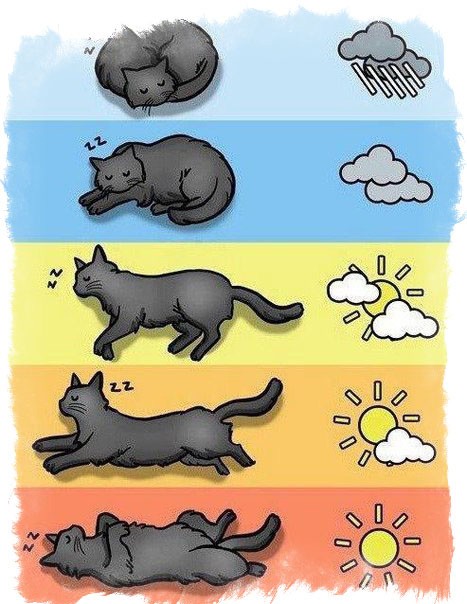 • Если вольготно раскидывается на полу - скоро начнётся оттепель. Хорошо, когда при этом котейка старательно намывает лапой морду - можете смело настраиваться на погожие деньки. Даже если за окном бушуют буря с градом, они ненадолго.