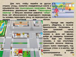 Для того, чтобы перейти на другую сторону улицы, имеются определенные места и называются они пешеходными переходами. Они обозначены дорожными знаками "Пешеходный переход" и белыми линиями разметки "зебра". Если нет обозначенного пешеходного перехода, ты можешь переходить улицу на перекрестках по линиям тротуаров или обочин. Прежде чем перейти дорогу, убедитесь в полной безопасности. Остановись у края проезжей части, прислушайся, посмотри налево и, если нет машин, дойди до середины проезжей части. Еще раз посмотри направо, и при отсутствии транспорта закончи переход. Дорогу нужно переходить под прямым углом и в местах, где дорога хорошо просматривается в обе стороны.