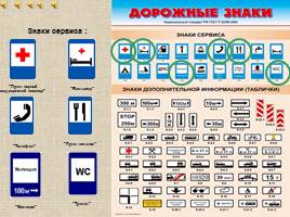 Знаки сервиса: "Пункт первой медицинской помощи" "Больница" "Телефон" "Пункт питания" "Милиция" "Туалет"