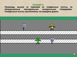 Ситуация 5. Пешеходы вышли из трамваев на посадочные пункты, не оборудованные приподнятыми посадочными площадками. Посадочные пункты расположены на середине дороги