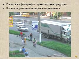 Укажите на фотографии транспортные средства. Покажите участников дорожного движения.