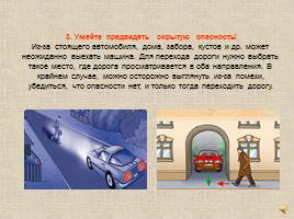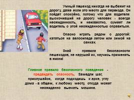 Умный пешеход никогда не выбежит на дорогу, даже если это место для перехода. Он пойдет спокойно, потому что для водителя выскочивший на дорогу человек - всегда неожиданность, и неизвестно, сумеет ли водитель с этой неожиданностью справиться. Опасно играть рядом с дорогой: кататься на велосипеде летом или зимой на санках. Знай правила безопасности пешеходов, не нарушай их, научись применять в жизни! Главное правило безопасного поведения - предвидеть опасность. Замедли шаг, прислушайся, когда подходишь к арке, углу дома - в общем, к любому месту, откуда может неожиданно выехать машина.