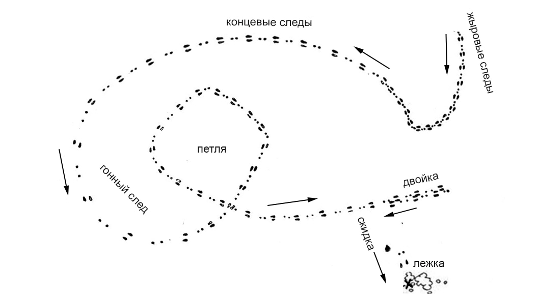 Двойка – это когда заяц, пробежав вперед, возвращается немного назад по своему следу, а затем резко меняет направление, совершая скидку или просто поменяв направление бега.