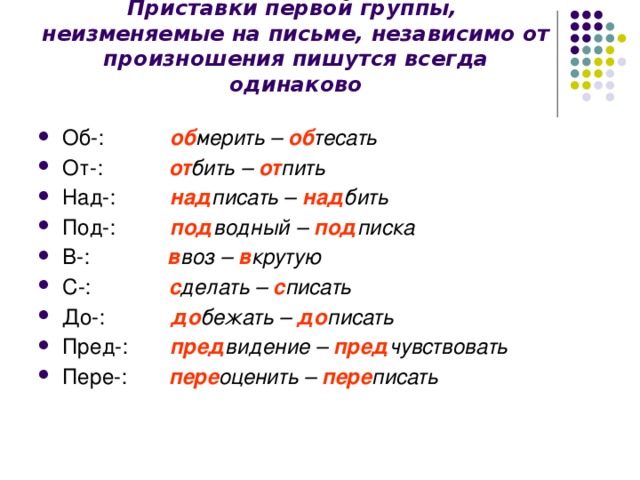 Приставки первой группы, неизменяемые на письме, независимо от произношения пишутся всегда одинаково