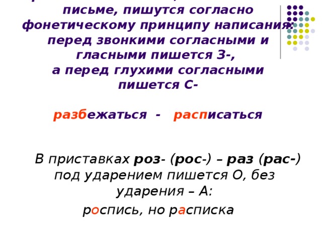4. В приставках роз- (рос-) и раз- (рас-) под ударением надо писать гласную о, без ударения - а: розыгрыш - разыграть; роспись - расписаться.