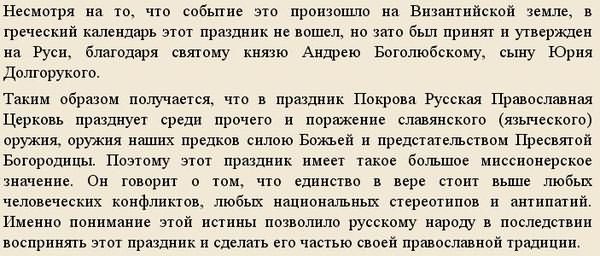 В XII веке этот праздник стали отмечать и на Руси с подачи внука Владимира Мономаха – святого князя Андрея Боголюбского. Богоматерь не единожды помогала в тяжелых кровопролитных боях русским войскам, за что в честь ее князья и цари воздвигали храмы и соборы. Украинские казаки считали Богоматерь своей покровительницей, а праздник Покров – одним из самых великих в православной Церкви.