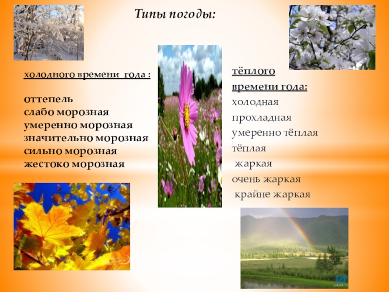 Типы погоды: холодного времени года : оттепель слабо морозная умеренно морозная значительно морозная сильно морозная жестоко морозная
