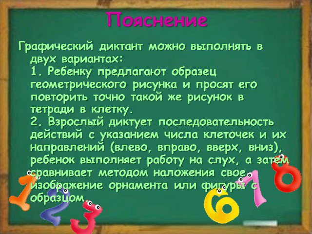 Графический диктант можно выполнять в двух вариантах: 1. Ребенку предлагают образец геометрического рисунка и просят его повторить точно такой же рисунок в тетради в клетку. 2. Взрослый диктует последовательность действий с указанием числа клеточек и их направлений (влево, вправо, вверх, вниз), ребенок выполняет работу на слух, а затем сравнивает методом наложения свое изображение орнамента или фигуры с образцом.