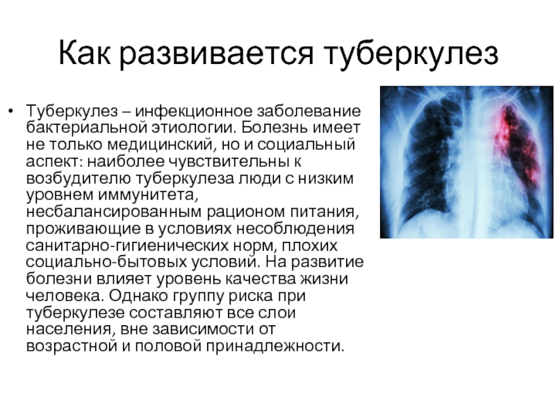 Туберкулез – инфекционное заболевание бактериальной этиологии. Болезнь имеет не только медицинский, но и социальный аспект: наиболее чувствительны к возбудителю туберкулеза люди с низким уровнем иммунитета, несбалансированным рационом питания, проживающие в условиях несоблюдения санитарно-гигиенических норм, плохих социально-бытовых условий. На развитие болезни влияет уровень качества жизни человека. Однако группу риска при туберкулезе составляют все слои населения, вне зависимости от возрастной и половой принадлежности.