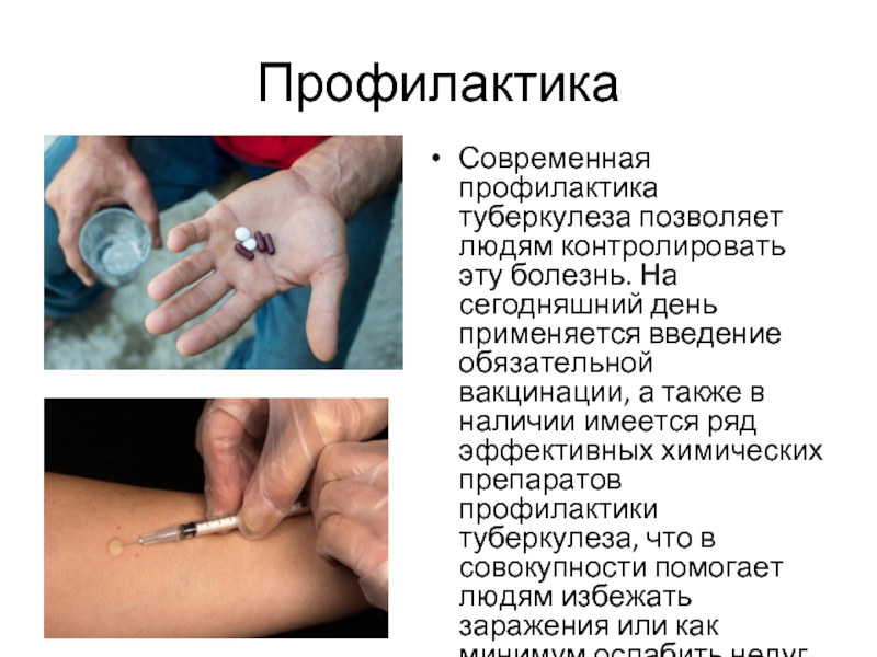 Современная профилактика туберкулеза позволяет людям контролировать эту болезнь. На сегодняшний день применяется введение обязательной вакцинации, а также в наличии имеется ряд эффективных химических препаратов профилактики туберкулеза, что в совокупности помогает людям избежать заражения или как минимум ослабить недуг.