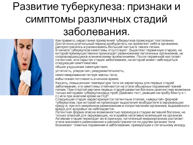 Кашель, повышенная температура тела не характерны для первых стадий заболевания, эти симптомы отмечаются на этапе обширных поражений тканей легких. При стертой картине первых стадий развития болезни диагностика возможна только методами туберкулиновых проб (Диаскин-тест, реакция на пробу Манту и т. п.) или при анализе крови на ПЦР. Следующая стадия характеризуется латентным этапом, «закрытой» формой туберкулеза, при которой не происходит выделения возбудителя в окружающую среду и, при его умеренном размножении и сопротивлении организма, выраженного вреда для здоровья не наблюдается. Латентная форма опасна возможностью перехода в стадию активной болезни, не только опасной для окружающих, но и крайне негативно влияющей на организм. Активная стадия переходит во вторичную, патогенный микроорганизм достигает этапа массового размножения и распространяется по другим органам тела. Возникают тяжелые поражения и заболевания, приводящие к летальному исходу.
