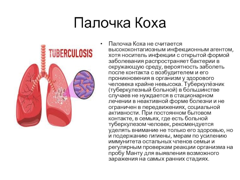 Палочка Коха не считается высококонтагиозным инфекционным агентом, хотя носитель инфекции с открытой формой заболевания распространяет бактерии в окружающую среду, вероятность заболеть после контакта с возбудителем и его проникновения в организм у здорового человека крайне невысока. Туберкулёзник (туберкулезный больной) в большинстве случаев не нуждается в стационарном лечении в неактивной форме болезни и не ограничен в передвижениях, социальной активности. При постоянном бытовом контакте, в семьях, где есть больной туберкулезом человек, рекомендуется уделять внимание не только его здоровью, но и подержанию гигиены, мерам по усилению иммунитета остальных членов семьи и регулярным проверкам реакции организма на пробу Манту для выявления возможного заражения на самых ранних стадиях.