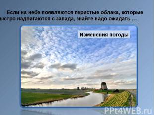 Перистые облака предвещают ненастье от двух дней и более. Если кучевые облака к вечеру исчезают - к хорошей погоде.