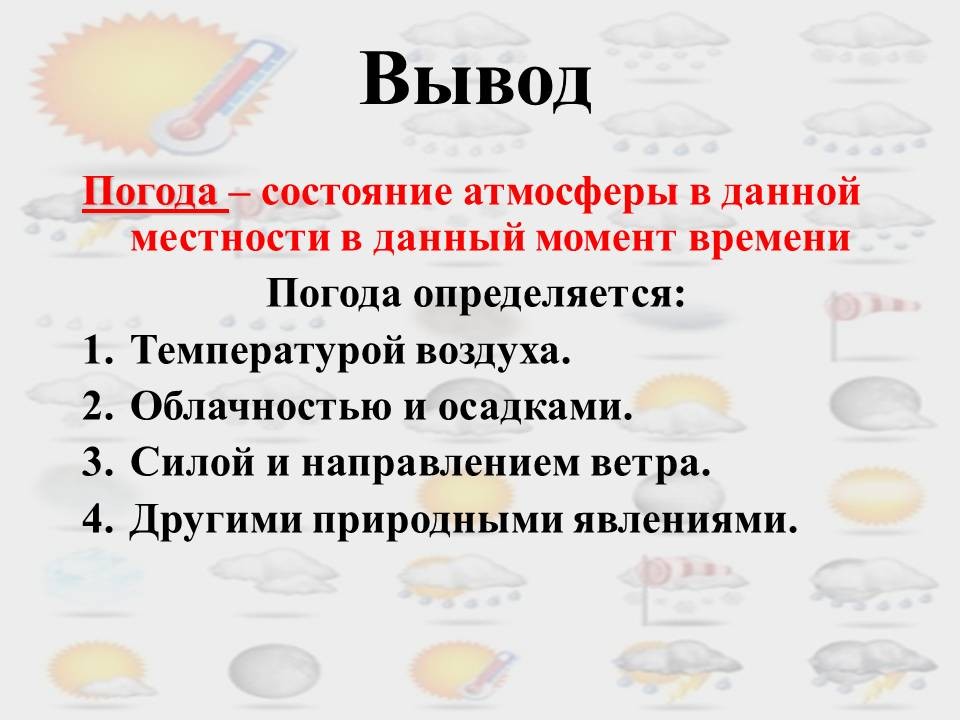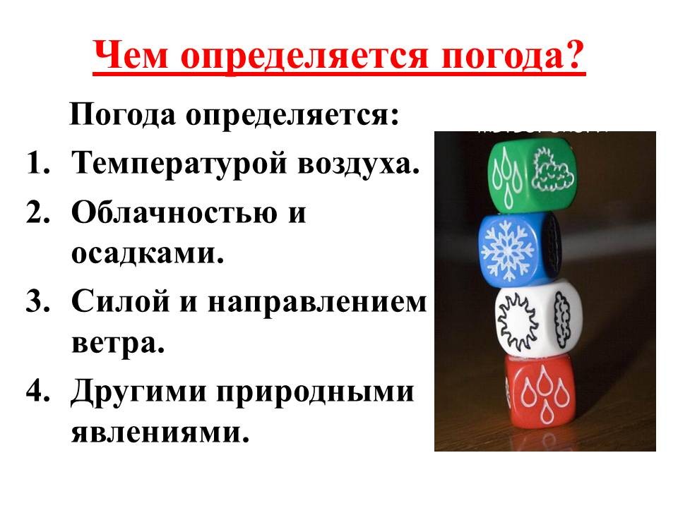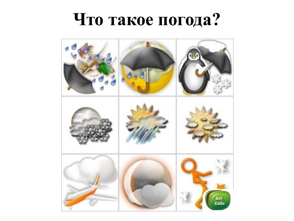 – Что включает в себя погода? (Температуру, давление, влажность, ветер, облачность, осадки.)