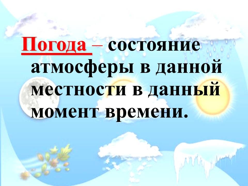 Погода – состояние атмосферы в рассматриваемом месте в определенный момент или за ограниченный промежуток времени (сутки, месяц). Обусловлена физическими процессами, происходящими при взаимодействии атмосферы с космосом и земной поверхностью. Характеризуется метеорологическими элементами и их изменениями.