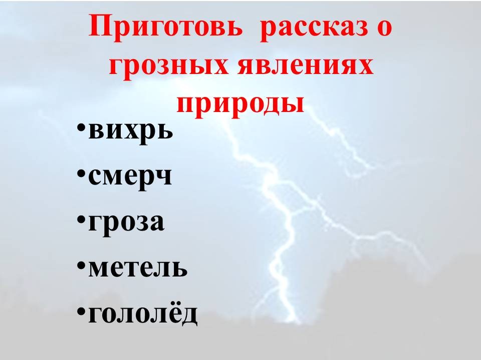 Домашнее задание: Приготовь рассказ о грозных явлениях природы. Найдите народные приметы и запишите в тетрадь.