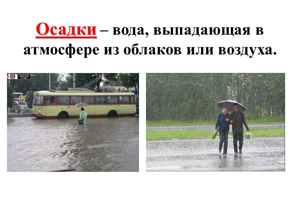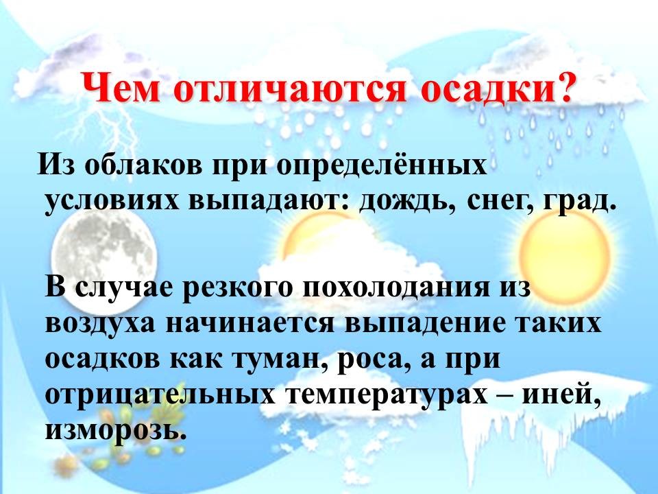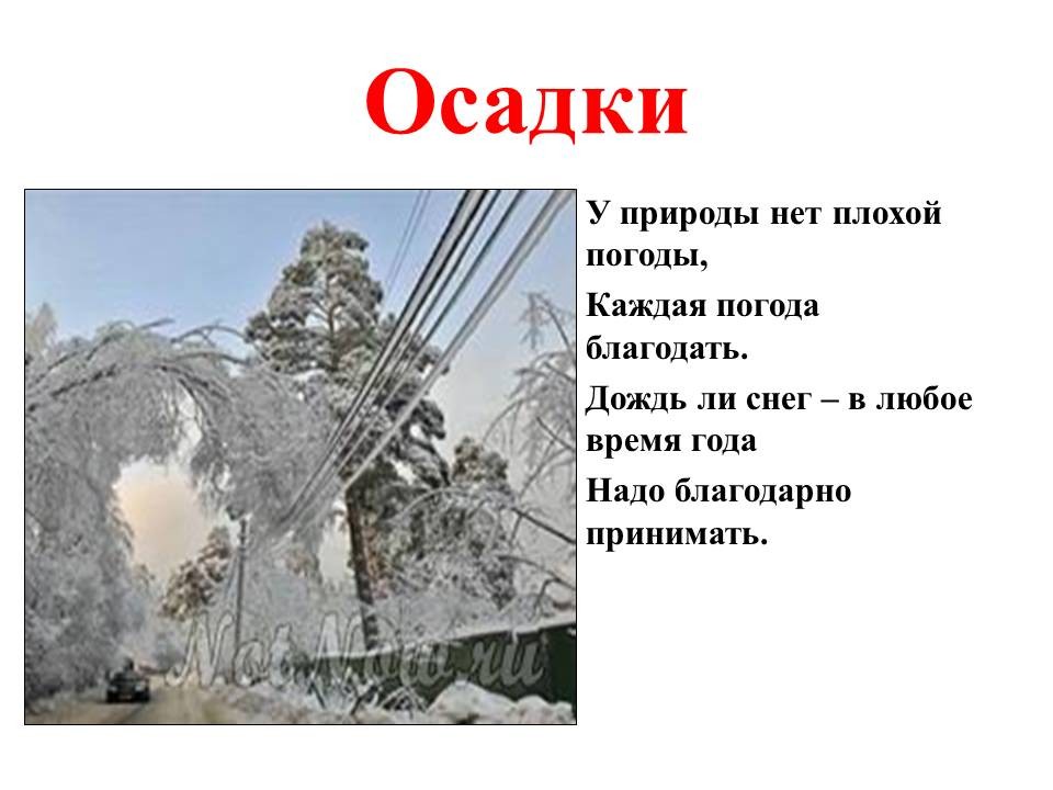 – Что такое дождь и снег? (Осадки.) Какие ещё осадки вам известны? Для каких времён года они характерны, когда их можно наблюдать?